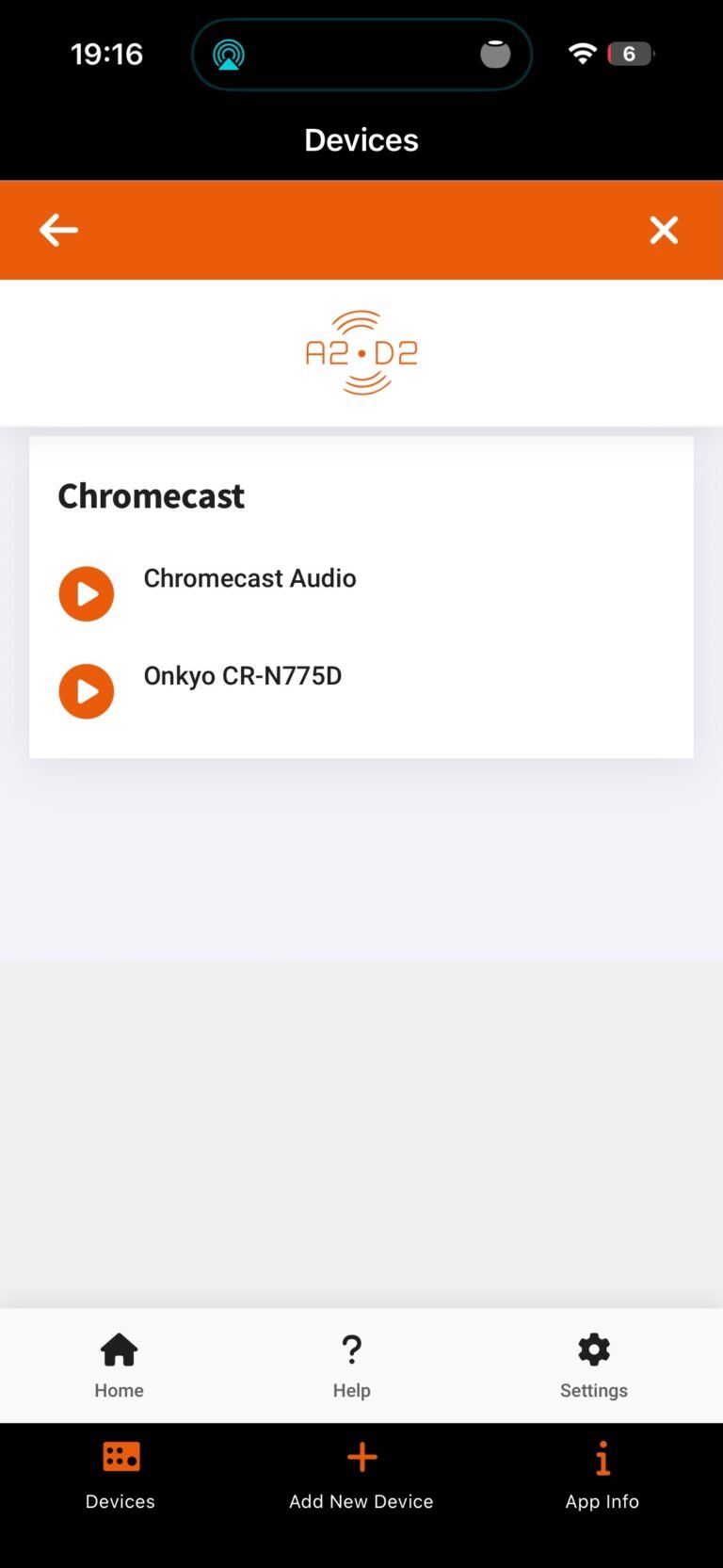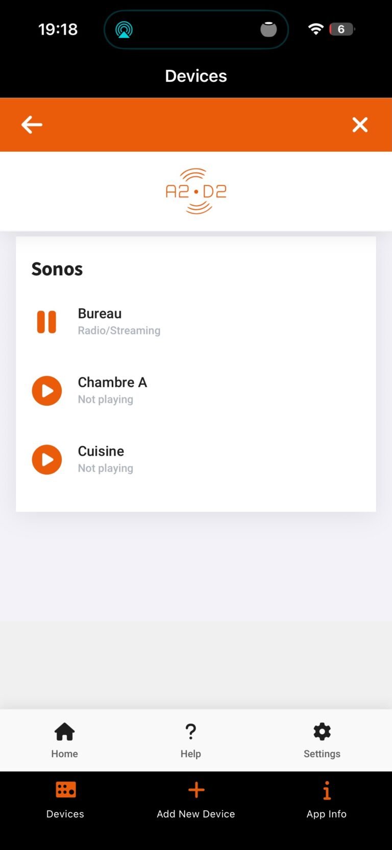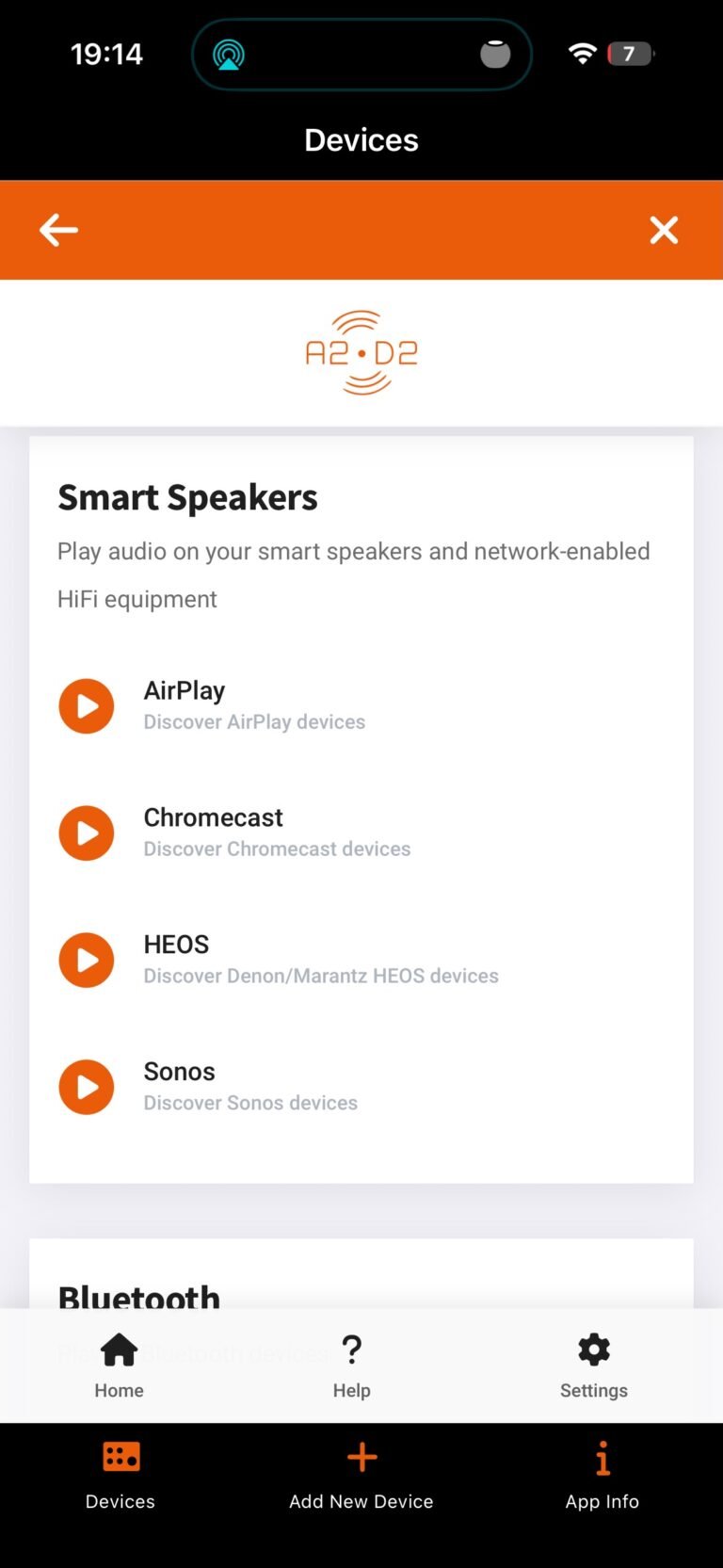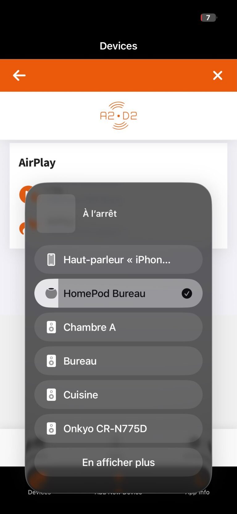 Ensuite, l’écran d’accueil sert à sélectionner dans quel standard multiroom on souhaite transmettre la musique. J’appuie sur Sonos, HEOS, AirPlay ou Google Cast, et à chaque fois l’app m’affiche la ou les enceintes compatibles sur mon réseau. Je sélectionne celle que je veux et la musique démarre, rien de plus simple. Il y a un délai, le temps que la musique se mette en mémoire.